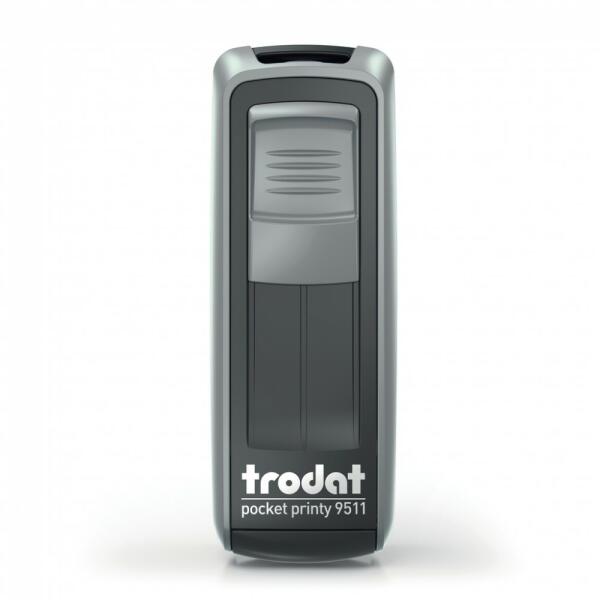 Trodat Pocket Printy 9511 ECOBLACK-SILVER zsebbélyegző (38x14 mm) lenyomattal együtt használatra készen. A Trodat Pocket Printy 9511 a legkedveltebb önfestékező zsebbélyegző fekete-ezüst színben. A zsebbélyegzőcsalád kisméretű tagja maximum 4 sor szöveggel, fekete-ezüst színű vázzal. Tökéletes megoldás azok számára, akik sokat utaznak, és a bélyegzőre is gyakran szük