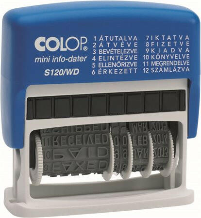 Dátum- és szövegbélyegző, 12 féle szöveggel, COLOP "S120/WD" - azonnali használatra kész dátumbélyegző a leggyakrabban használt irodai szavakkal - év/hónap/nap dátumformátummal - az évszalag 12 évig használható - a szöveg kék, a keltezés piros színben jelenik meg - S120 WD választható szövegek: ÁTUTALVA, ÁTVÉVE, BEVÉTELEZVE, ELINTÉZVE, ELLENŐRIZVE, ÉRKEZETT, FIZE