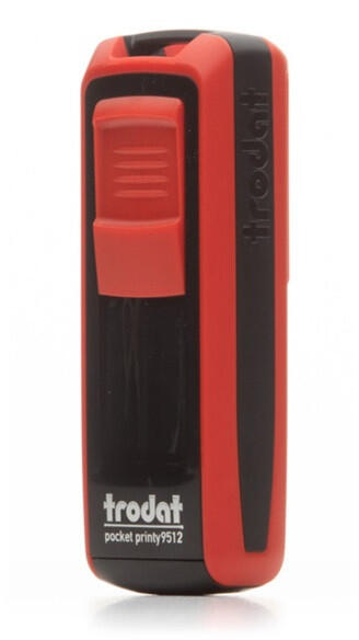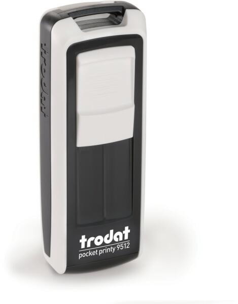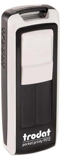 Trodat Pocket Printy 9512 ECOBLACK-WHITE zsebbélyegző (47x18 mm) lenyomattal együtt használatra készen. A Trodat Pocket Printy 9512 a legkedveltebb önfestékező zsebbélyegző fehér-fekete színben. A zsebbélyegzőcsalád közepes méretű tagja maximum 5 sor szöveggel, fehér-fekete színű vázzal. Tökéletes megoldás azok számára, akik sokat utaznak, és a bélyegzőre is gyakran