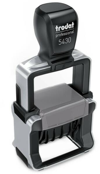 Trodat Professional 5430 fémházas dátumbélyegző ( 41 x 24 mm ) lenyomattal. Stabil 4-mm magas dátummal, könnyed fogaskerekes állítással. A zárt burkolatnak köszönhetően nem érintkezünk a tintázott felülettel. A Professional ideális bélyegző a mindennapi irodai használatra. Tökéletesen kézbe fekszik az ergonomikusan kialakított fogantyúnak köszönhetően. Masszív acélv