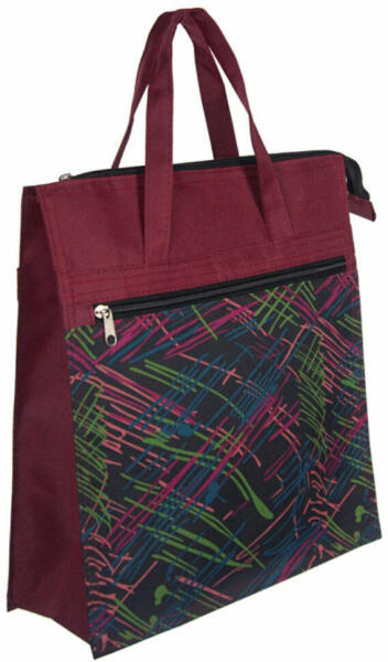 Gyöngyvászonból készült bordó alapszínű bevásárló táska. Felül cipzárral zárható. Szélesre nyitható, könnyű bele a pakolás. Az elején lévő 33 cm széles és 26 cm magas, cipzárral zárható lapos zseb előlapja színes mintás gyöngyvászon anyagból készült. Belseje egyterű. Bélése nincs. A bevásárló táska két kézi fogóval rendelkezik.