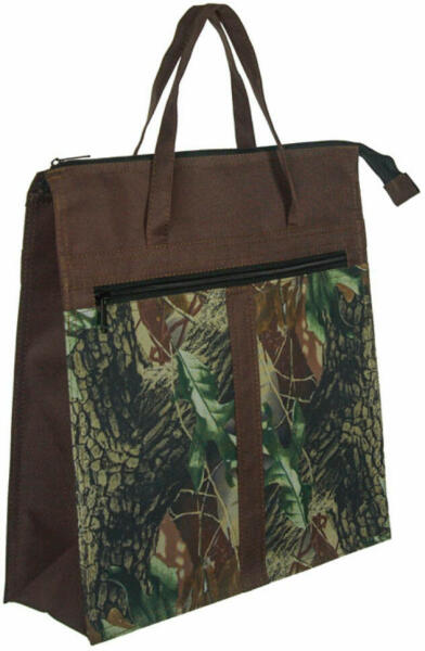 Gyöngyvászonból készült barna alapszínű bevásárló táska. Felül cipzárral zárható. Szélesre nyitható, könnyű bele a pakolás. Az elején lévő 33 cm széles és 26 cm magas, cipzárral zárható lapos zseb előlapja őszi erdőt ábrázoló gyöngyvászon anyagból készült. Belseje egyterű. Bélése nincs. A bevásárló táska két kézi fogóval rendelkezik. A mintázat min