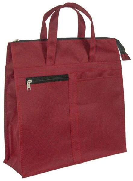 Gyöngyvászonból készült bordó bevásárló táska. Felül cipzárral zárható. Szélesre nyitható, könnyű bele a pakolás. Belseje egyterű. Elején van egy 13 cm-es cipzárral zárható 16 cm széles és 24 cm magas lapos zseb valamint egy 16 cm széles, 23 cm magas felül nyitott, szintén lapos zseb. Bélése nincs.