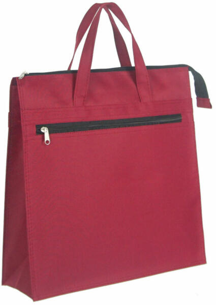Bordó gyöngyvászonból készült bevásárló táska. Felül cipzárral zárható. Szélesre nyitható, könnyű bele a pakolás. Az elején van egy teljes szélességű 28 cm magas, 33 cm hosszú cipzárral zárható lapos zseb. Belseje egyterű. Bélése nincs. A bevásárló táska két kézi fogóval rendelkezik.