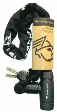 Tulajdonságok Kerékpár lezáró, láncos, integrált fejjel. 8 mm-es kör keresztmetszetű titán-acél ötvözet Méret: 8mmx900mm Szín: fekete gyöngyvászon borítás, aranyszínű felirattal VELOTECH logóval Zárása: biztonsági kulccsal 6db / csomag %