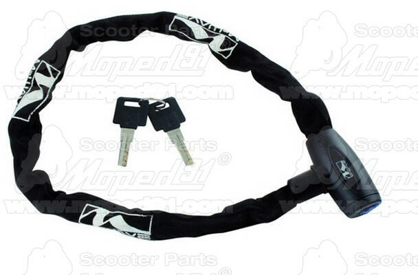 Alap védelem az alacsony kockázatú lopások ellen. Alacsonyabb árkategóriájú és gyerek kerékpárok lezárására ajánlott. 4 mm vastag négyszögletes lánc anyaghuzat borítással, amely védi a vázat a sérülésektől. Könnyű lakat. Háromjegyű számkombináció. Könnyen szállítható a nyeregcső köré tekerve.