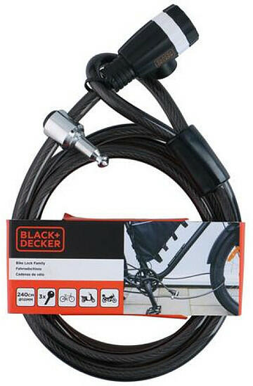Márka: BLACK+DECKER | Típus: BXCHBL7005 | Anyag: PVC és acél (kábel), PP és ABS (zártest), cink ötvözet (henger), sárgaréz és nejlon (kulcs) | Incl. 3 kulcs | Alkalmas kerékpárhoz, motorkerékpárhoz és robogóhoz | -20oC-ig használható | Zár hossza: 240 cm | Zár átmérő: 10 mm