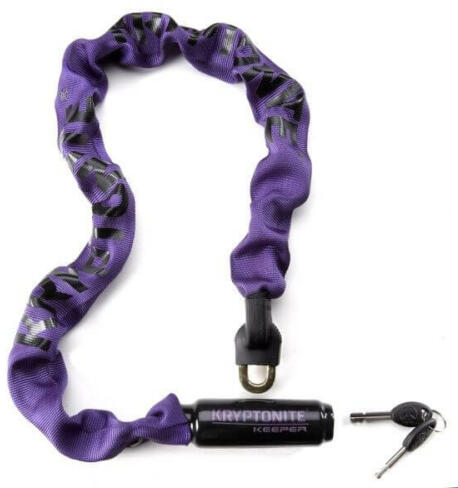 Kryptonite Keeper Mini 785 integrált láncos lakat, 7 mm x 85 cm, lila A Kryptonite, limitált darabszámban elérhető, színes lakatjainak egyike a KEEPER 785 lila láncos lakat. Tartós, védelmező nylon borítás Négyzetes 7mm átmérőjű 3t (triplán hőkezelt) mangán ötvözetű acél láncszemek. Az utolsó láncszem kialakítása tökéletes illeszkedést biztosít a zárszerkezetben.