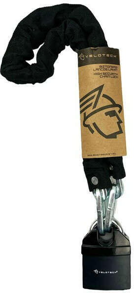 Kerékpár lezáró, láncos. 8 mm-es négyszög keresztmetszetű titán-acél ötvözet Méret: 8mmx900mm Szín: fekete gyöngyvászon borítással, Velotech felirattal VELOTECH logóval Zárása: mini-Ulakattal 6db / csomag %