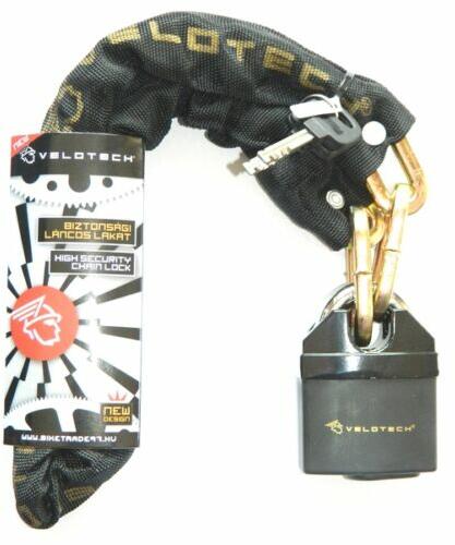 Tulajdonságok Kerékpár lezáró, láncos. 8 mm-es négyszög keresztmetszetű titán-acél ötvözet Méret: 8mmx900mm Szín: fekete gyöngyvászon borítással, aranyszínű felirattal VELOTECH logóval Zárása: mini-Ulakattal 6db / csomag %