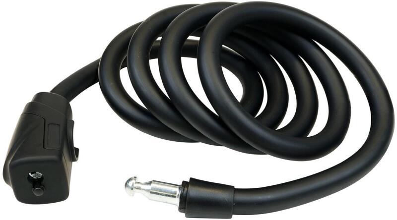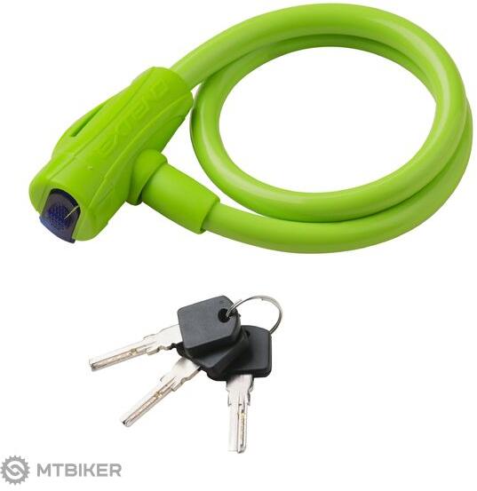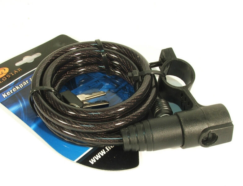 kábelzár tekercses acélkábellel színes huzalburkolattal hossza 650mm átmérő 12mm hengerbetét 3 kulccsal porvédő sapka – védi a zárat a nedvességtől és a szennyeződéstől
