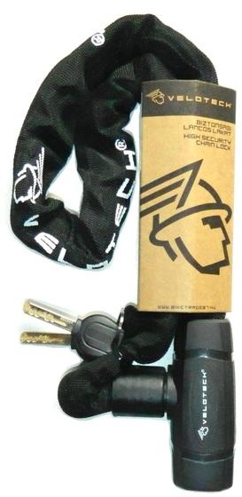 Kerékpár lezáró, láncos, integrált fejjel. 8 mm-es kör keresztmetszetű titán-acél ötvözet Méret: 8mmx900mm Szín: fekete gyöngyvászon borítás, aranyszínű felirattal VELOTECH logóval Zárása: biztonsági kulccsal