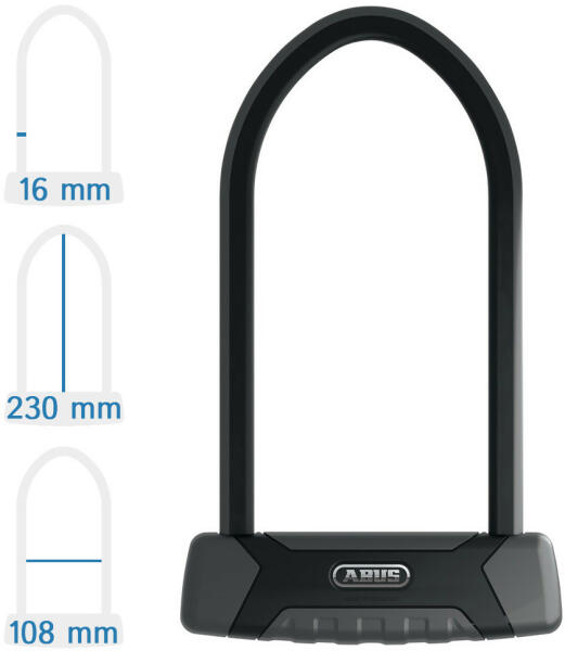 Abus 540/160HB230 + USH540 kerékpár U lakat: 13 mm-es, edzett, négyszögletes parabolakengyel USH 540 - Tartó a zár kerékpáron való szállításához. A műanyag bilinccsel 15 - 35 mm átmérőjű kerek csövekre rögzíthető. Az ABUS Power Cell technológia maximális védelmet nyújt az ütés és a hozzáférés ellen A kengyel, a ház, valamint a reteszelőmechanika teherviselő alkat