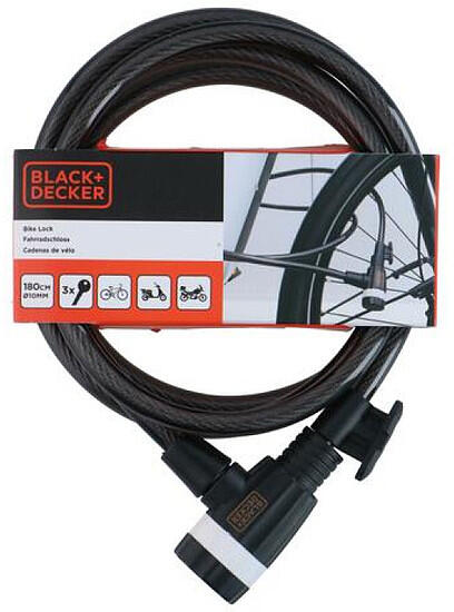Márka: BLACK+DECKER | Típus: BXCHBL7002 | Anyag: PVC és acél (kábel), PP és ABS (zártest), cink ötvözet (henger), sárgaréz és nejlon (kulcs) | Incl. 3 kulcs | Alkalmas kerékpárhoz, motorkerékpárhoz és robogóhoz | -20oC-ig használható | Zár hossza: 180 cm | Zár átmérő: 10 mm