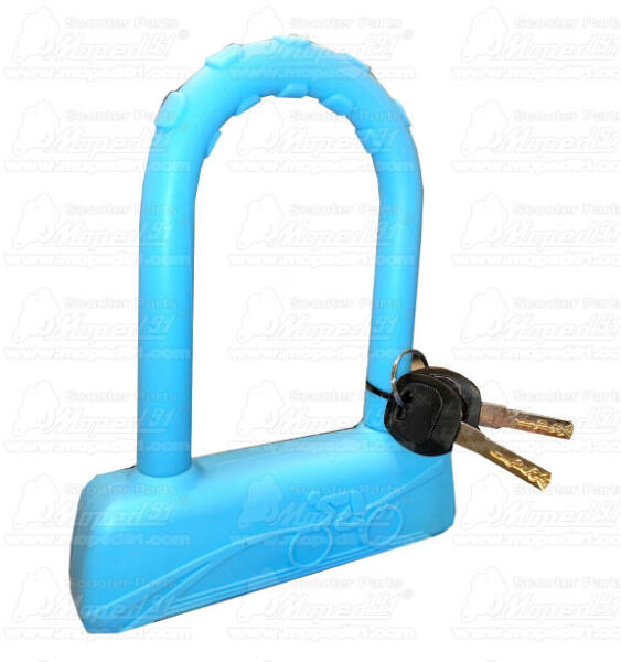 Világos kék színű U-lakat. 14 mm-es átmérőjű edzett acélból készült lakat. A tolvajnak ezzel nehezebb a dolga, mert mindakét szárat át kell vágnia, hogy elvihesse járművünket. A lakathoz kerékpárra, rollerre szerelhető tartó is tartozik. Mérete: 14mm x 142mm x 77mm.