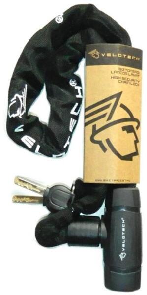 Kerékpár lezáró, láncos, integrált fejjel. 8 mm-es kör keresztmetszetű titán-acél ötvözet VELOTECH logóval