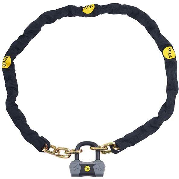 edzett acél hatszögletes lánc, 10 mm-es hegesztett láncszemek, időjárásálló galvanizálás, erős textilbevonat véd a karcoktól, prémium minőségű lakat, speciális edzett 14 mm-es acél kengyel, dupla acélgolyós reteszelés, védőburkolat a testen és a kengyelen, precíziós zárszerkezet, speciális lézervágott kulcs (kódkártyás), finomnyitás elleni védelem, motorkerékp