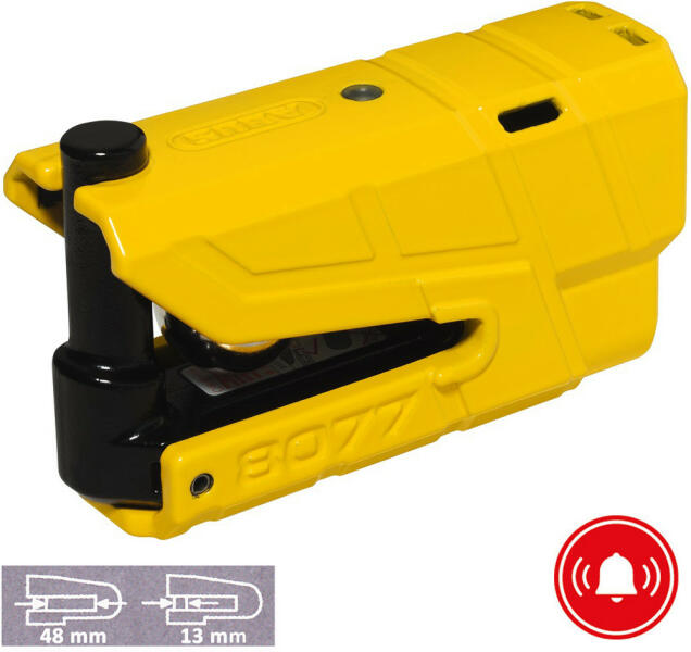 Abus Granit Detecto X-Plus 8077 Yellow riasztós féktárcsazár: Lamellás rendszerű biztonsági zárbetét működtetéssel Mozgásérzékelős 3D riasztó, 100db hangerővel Nyitás és a riasztás deaktiválása kulccsal Zárás után a 3D mozgásérzékelő azonnal aktív. A riasztó működését 2db AAA elem biztosítja, ami a csomag részét képezi, csakúgy, mint a hordtáska 2 db kulcs