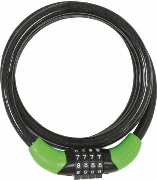 spirálzár tekercselt acélkábellel és füst PVC bevonattal a kábelen állítható zárkód 5 szám kombinációval tárcsázza a kontrasztos zöld színt a zárkód egyszerűbb beállításához hossza 1800mm átmérő 12mm