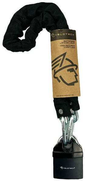 Kerékpár lezáró, láncos. 8 mm-es négyszög keresztmetszetű titán-acél ötvözet Méret: 8mmx900mm Szín: fekete gyöngyvászon borítással, Velotech felirattal VELOTECH logóval Zárása: mini-Ulakattal 6db / csomag %