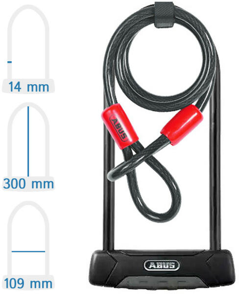Abus 470/150HB230 + USH470 kerékpár U lakat: Cobra 12 mm-es átmérőjű, 120 cm husszú hurokkábellel, az első kerék védemére 12 mm-es edzett parabolakengyel Az ABUS Power Cell technológia maximális védelmet nyújt az ütések és a hozzáférések ellen A kengyel, a ház, valamint a reteszelőmechanika teherviselő alkatrészei speciálisan edzett acélból készülnek USH 470 - Tartó