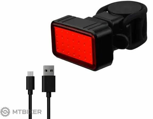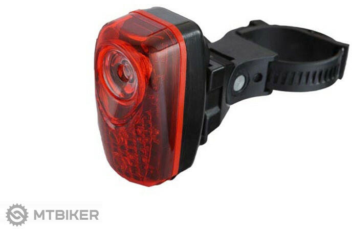 Hátsó világítás három piros LED-del, amelyek közül az egyik 0,5 W teljesítményű Funkciók : villog - csak egy világít - állandó fény Rögzítés bilinccsel az üléscsőre A csomag 2 db AAA elemet tartalmaz Szín : fekete