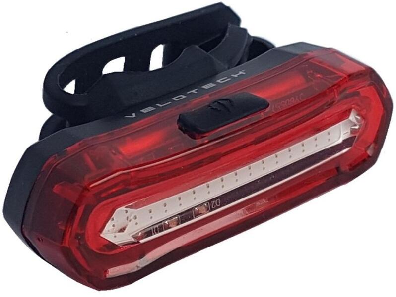 Velotech hátsó lámpa 16 chipLED-del, Funkció: Folyamatos villágítás - villogó funkció. Féklámpa funkció: erőteljes lassítás vagy megállás határára 3másodpercig erősfényű folyamatos villágításra vált! Gumipántos rögzítés Vizálló Beépített akkumlátorral Micro USB-vel tölthető (tartozék) Töltési idő: 3 óra