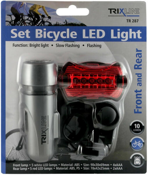 Trixline TR 287 kerékpár LED lámpa szett melynekfényforrása 5 db fehér LED (első) és 5 db piros LED (hátsó). V ilágítási mód 100 %, lassú villogás, villogás. Energia ellátás azelső 4× AAA (mikroceruza), hátsó 2× AAA (mikroceruza) elemmel működik. M éret: 78 x 42 x 25 mm S úly: 0,103kg