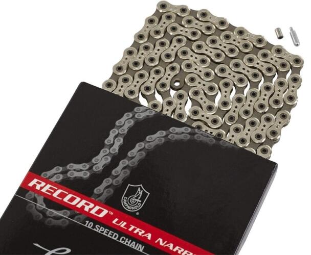Campagnolo Record 11 sebességes Ultra Narrow lánc - Szélesség 5,5 mm - Ultra-Link szegecselő rendszer - Külső láncszemek speciális új acélból - Ni-PTFE kopásgátló kezelés - Üreges szegecsek - Súly : 240 g - Sebességszám : 2x11 Minden Campagnolo 11sp lánc. kompatibilisek az összes 11sp készlettel. Élettartamuk megegyezik (3000 - 8000km), csak a keletkező tömegben térnek e