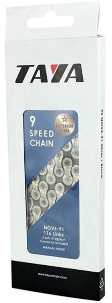 Kiváló minőségű, nagy teherbírású, 9 sebességes kerékpárlánc, anyaga: acél, szín: ezüst/szürke, 116 tagú. Kerékpárlánc 9 sebességes Anyaga: acél Szín: ezüst/szürke
