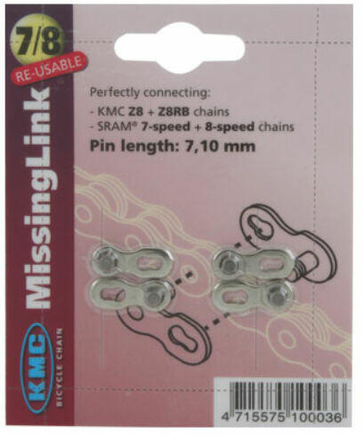 Tulajdonságok 3/32" 8 speed KMC Z8.1, Sram 7 & 8 sebességes láncokhoz Csp hossza 7.10 mm Többször használható 2 db/csomag!