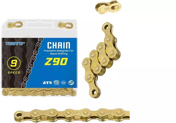 Toopre Z90 kerékpár lánc, 9s, 116 szem, patentszemmel, arany színű Jó ár-érték arányú, sport és hobbi célokra alkalmas kerékpárlánc, MTB, országúti és trekking kerékpárokra. Aranyszínű bevonata sokáig megvédi a láncot a rozsdásodástól és rendkívül dekoratív megjelenést ad a kerékpárodnak. 116 tagú, 11/128-as szélességű lánc, Shimano és SRAM 9 sebességes v