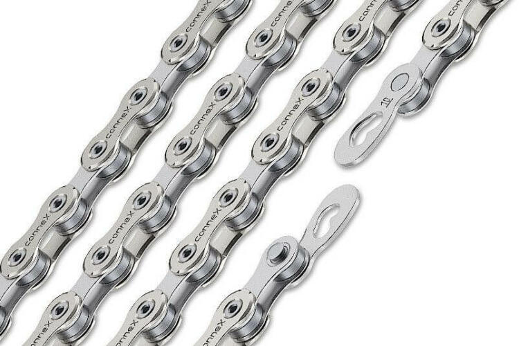 Connex 10S1 Hollowpin kerékpár lánc, 10s, 114 szem, patentszemmel, ezüst A láncszemek kialakítás csendes és precíz váltást biztosít. Használható országúti és MTB rendszerekhez is. A rozsdamentes acél csapok és a nikkelbevonatú lemezek különlegesen hosszú futást biztosítanak Az üreges csapoknak köszönhetően a legkönnyebb 10-es láncok egyike. Connex Link patentszemmel