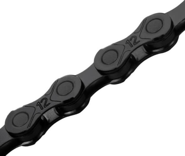 KMC DLC12 kerékpár lánc, 12s, 126 szem, patentszemmel, fekete Számos fejlett technológiát felvonultató felsőkategóriás 12 sebességes lánc látványos fekete felületkezeléssel. Kompatibilis: Shimano, SRAM, Sunrace és más 12 sebességes rendszerekkel Diamond Like Coating bevonat: csökkenti a koptató kopást az extra kemény felületnek köszönhetően. Optimális stabilitást és n