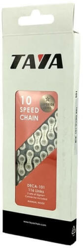 Taya Deca-101 kerékpár lánc, 10 sebességes, 116 szem, hollow pin, ezüst-szürke 116 tagú, 10 sebességes rendszerekhez kedvező árú lánc váltást segítő kialakítással, nagy keménységű üreges csapokkal DHT felületkezelés (Diamond Hard Treatment) a tartósságért 2 pár Sigma+ láncpatentszem tartozék! Nem ismered ez a márkát? Vidd a neve fölé a kurzort, és mutatjuk! 1000-