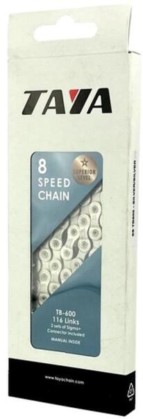 Kiváló minőségű, nagy teherbírású, 8 sebességes kerékpárlánc, anyaga: acél, szín: ezüst, 116 tagú. Kerékpárlánc 8 sebességes Anyaga: acél. Szín: ezüst/ezüst