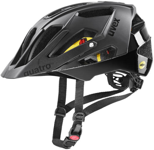 Az Uvex Quatro CC MIPS MTB kerékpár sisak double inmould felépítésének köszönhetően könnyű, ugyanakkor tartós és ellenálló, a beépített MIPS rendszer pedig extra védelmet nyújt az ütközés pillanatában fellépő csavaró hatású erőkkel szemben. Nagyméretű, anatómikus kialakítású méretállító pánttal és állítható napellenzővel. MIPS védelem a csavaró hatás