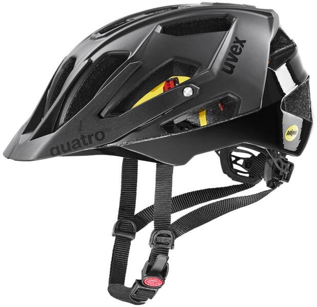 Az Uvex Quatro CC MIPS MTB kerékpár sisak double inmould felépítésének köszönhetően könnyű, ugyanakkor tartós és ellenálló, a beépített MIPS rendszer pedig extra védelmet nyújt az ütközés pillanatában fellépő csavaró hatású erőkkel szemben. Nagyméretű, anatómikus kialakítású méretállító pánttal és állítható napellenzővel. MIPS védelem a csavaró hatás