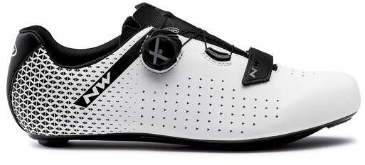 Northwave Road Core Plus 2 országúti kerékpáros cipő, SPD-SL, fehér-fekete, 45,5-es Méretek: 38–48 (feles méretek is) Talp: NRG Air, karbonnal erősített üvegszálas kivitel, megfelelő merevség, csökkentett súly, öt szellőzőnyílás. SPD kompatibilissé alakítható. Felsőrész: az egybeszabott, varrásmentes kialakítás csökkenti a nyomáspontokat. Négy hálós szellőzőbe