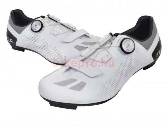FLR F-11 országúti kerékpáros cipő, SPD-SL, fehér, 44-es Az F-11 felsőrésze az R250 országúti talpon nyugszik, amely kompromisszum-mentesen tartós, jó teljesítményt nyújt és kényelmes. A lelkes kerékpárosoknak készült. Az újratervezett nylon talp a merevség, súly és kényelem tökéletes kombinációja. Az elől lévő nyílás biztosítja a szellőzést. Két csúszásmen