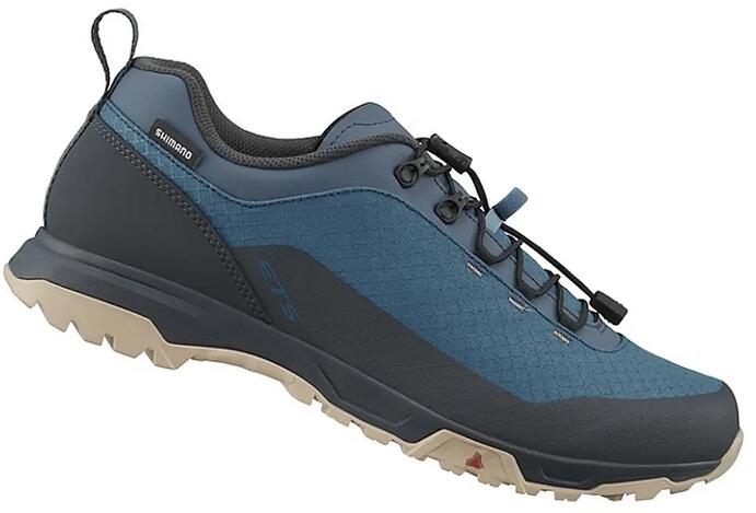 Shimano SH-ET501 férfi trekking és túra kerékpáros cipő, fűzős, kék, 43-as Sportos, lapos talpú hobbi kerékpáros cipő túrázásra, könnyű terepre, városi kerékpározásra, vagy e-bike-hoz. Gyorsszorítós fűzős kialakítással. Optimális egyensúly a hajtáshatékonyság és a kényelmes járás között. Figyelem! A cipőhöz nem rögzíthető automata pedálhoz való SPD sto