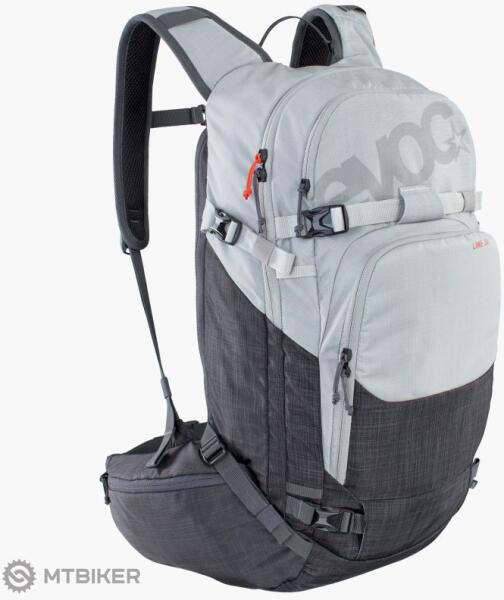 Evoc Line 30 hátizsák , freeride és backcountry számára. A hátizsák kiváló szellőzéssel , zsebbel a csípőövön , mobiltelefon zsebbel , gyorsan hozzáférhető zsebbel egy lapátnak és egy szondának vészhelyzeti tervvel, egy hidratáló táska , síp vagy szemüveg zsebbel. A hátizsák sisaktartóval rendelkezik, pántjai sílécek és snowboardok szállítására is használhat