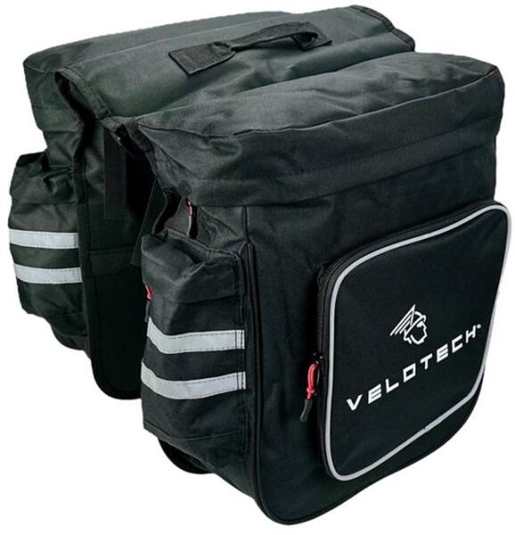 Velotech kétrészes hagyományos túratáska Anyaga: 600D vízálló cordura, PE erősítéssel. Szín: fekete, fényvisszaverő szegéllyel. Belső merevítés a stabil tartásért. Két oldalsó és hátsó zseb. 6 ponton rögzíthető (oldalt 2 csattal, felül 4 hevederrel). Tetején fogantyúval. Méretei: 2 x 30 x 13 x 30 cm Térfogat: 2 x 12 liter Súlya: 0,8 kg