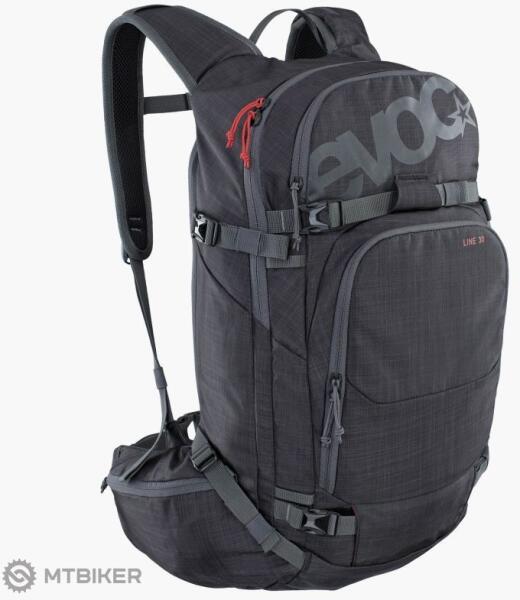 Evoc Line 30 hátizsák , freeride és backcountry számára. A hátizsák kiváló szellőzéssel , zsebbel a csípőövön , mobiltelefon zsebbel , gyorsan hozzáférhető zsebbel egy lapátnak és egy szondának vészhelyzeti tervvel, egy hidratáló táska , síp vagy szemüveg zsebbel. A hátizsák sisaktartóval rendelkezik, pántjai sílécek és snowboardok szállítására is használhat