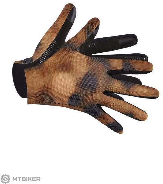 CRAFT ADV Kavicsos kerékpáros kesztyű hosszú ujjakkal, hálós felsőrésszel és szilikon nyomattal a tenyerén. Anyaga : hátlap - 85% újrahasznosított poliészter, 15% elasztán; tenyér - 95% poliészter, 5% elasztán - rugalmas rugalmas mandzsetta a csukló körül - rugalmas és légáteresztő háló szublimációs nyomtatással a kézfejen - puha frottír a hüvelykujjon - megerősí