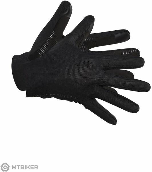 CRAFT ADV Gravel kerékpáros kesztyű hosszú ujjakkal, hálós felsőrésszel és szilikon nyomattal a tenyerén. Anyaga : hátlap - 85% újrahasznosított poliészter, 15% elasztán; tenyér - 95% poliészter, 5% elasztán - rugalmas rugalmas mandzsetta a csukló körül - rugalmas és légáteresztő háló szublimációs nyomtatással a kézfejen - puha frottír a hüvelykujjon - erősítés
