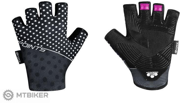 A Force Points nyári női kerékpáros kesztyű tömör hálós tenyérrel, béléssel, szilikonnal és csúszásgátló kezeléssel. A felső oldal finom elasztikus hálóból készült a jobb szellőzés érdekében. A kesztyűk hosszabb felső csuklószegéllyel és hurkokkal rendelkeznek a kesztyű könnyebb levétele érdekében. Kopás a tenyérben: igen
