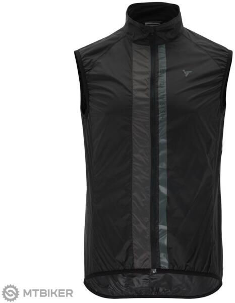 Könnyű férfi kerékpáros mellény meghosszabbított háttal, szélálló és lélegző Windbreaker anyagból. A mellény enyhén kiszélesedő szabású, állógallérral rendelkezik, a hátsó cipzáras zsebébe könnyen bepakolható.