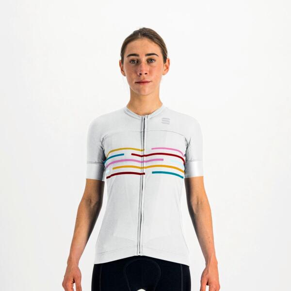 Női kerékpáros mez - rövid ujjú Típus: teljes cipzáras szétnyitható Anyag: 100% poliészter Szín: fehér Minta: logóval Zseb : hátsó