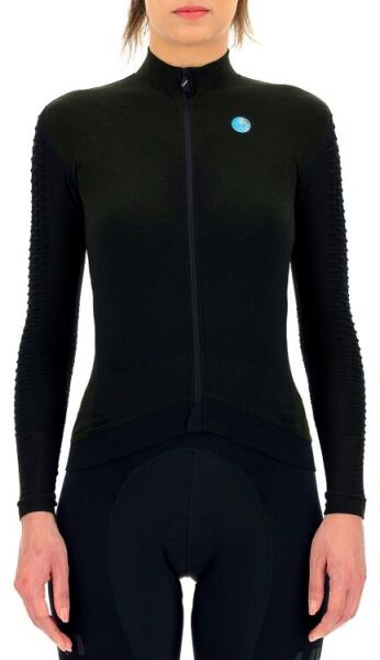 Női kerékpáros mez - hosszú ujjú Típus: teljes cipzáras szétnyitható Anyag: 100% poliészter Szín: fekete Minta: logóval Zseb : hátsó
